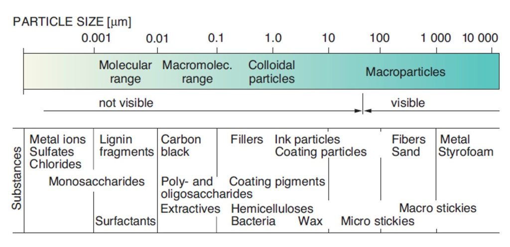 Figure 1 shows an overview of some substances encountered in recycled fibre pulps with their approximate particle size ranges. The extent to which they need to be removed depends on how much they interfere with paper manufacturing or product quality requirements.